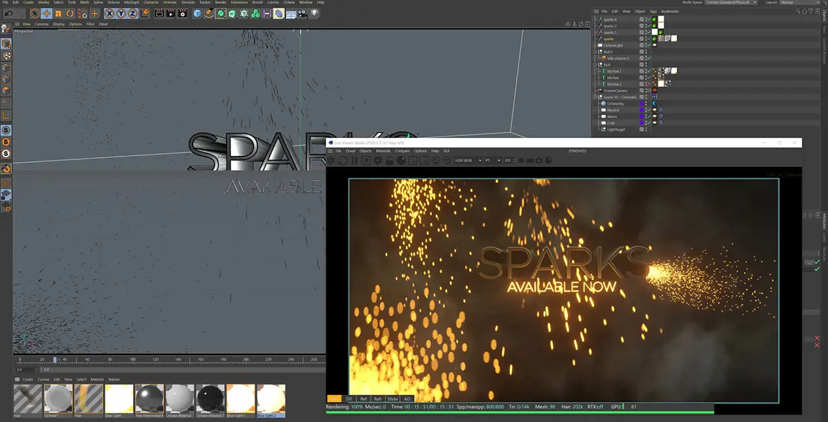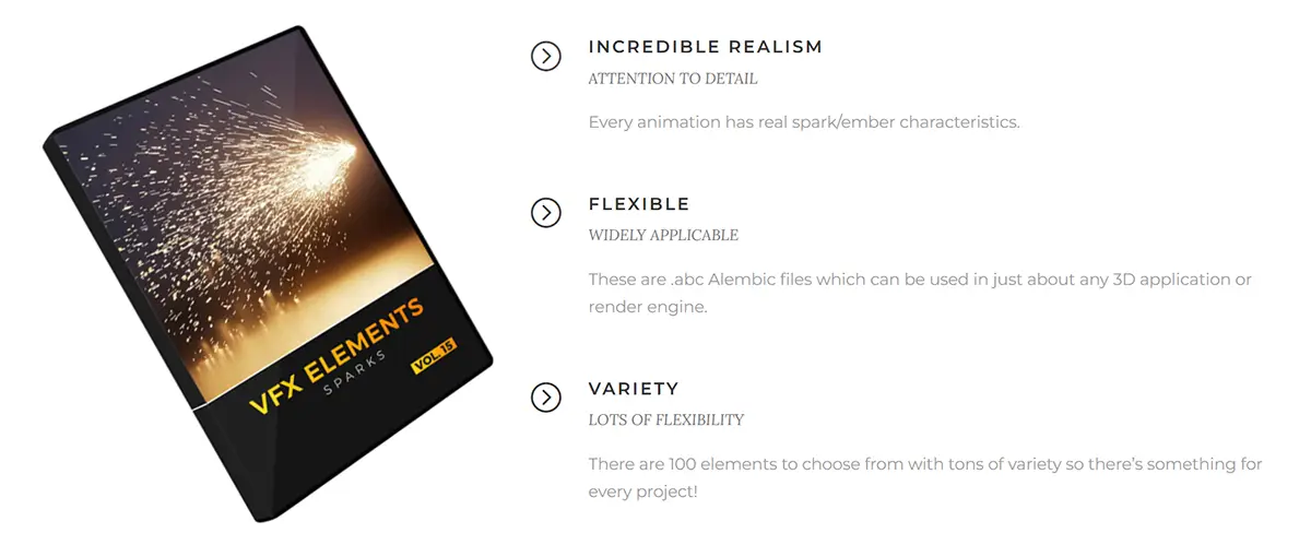 This product has 100 incredible 3D spark/ember animations which you can load into any render engine that supports them such as Blender, Octane, Redshift, Arnold, Houdini, Cycles and many more. They are .abc Alembic files which are super easy to use. Just drag and drop them into your scene, add a luminant texture and hit render!