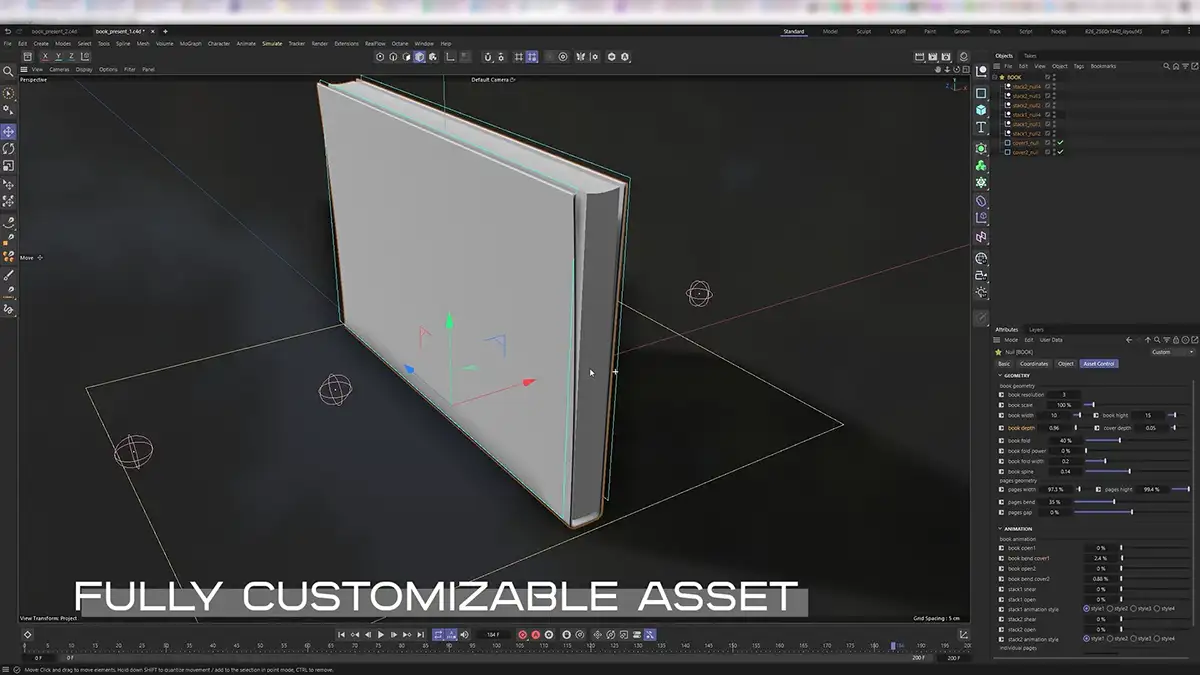 用户安装预设zip文件通过C4D资源管理器的“创建-导入资产”功能导入即可。无需写表达式拖入场景即可使用。支持拖拽添加多个实例,实现多本书摆放、彩书/杂志堆叠、互动书架等复杂场景。参数面板支持中文,描述详尽直观。可以导出Alembic、FBX、OBJ等主流三维动画格式,方便衔接Maya、Blender、Houdini、Unreal等其他虚拟引擎;同时预设参数可K帧动画符合美术预期。