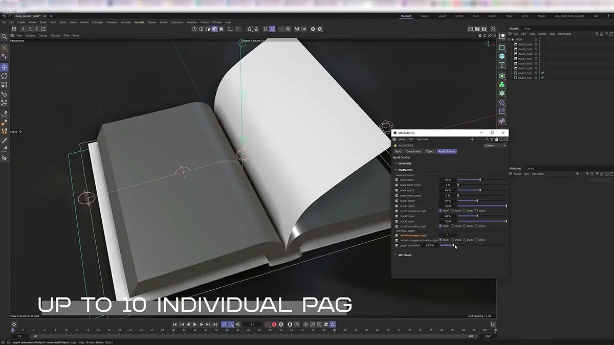 1、自动化和参数化带来建模与动画的“通用”与“可扩展”:通过一套模型资产灵活实现具体到参数,可调设置:书本整体宽度、高度、厚度、书脊弧度/扁平度、封面折角半径、内页弯曲弧度、每页纸张厚度、封面/封底/书脊/内页独立材质通道、页面数目(支持目前最多10页,每页可单独动画)、初始页码、当前翻动状态、翻页起始/结束页、翻页速度、页面动画曲线(如ease-in、ease-out等插值)、多页同步翻转、特定页独立动画、页面抖动/轻微风动等微动画。对于高阶用户,可通过Xpresso节点扩展自身逻辑,向接入Mograph多重实例器、分层动画,甚至与粒子/布料系统联动实现更高级的效果,如书本粒子化解体、悬浮翻转、拟物翻页、内容自动化更换。