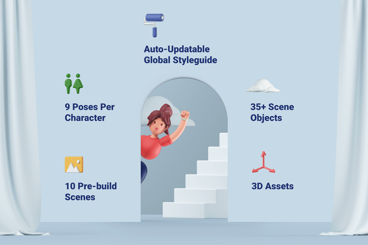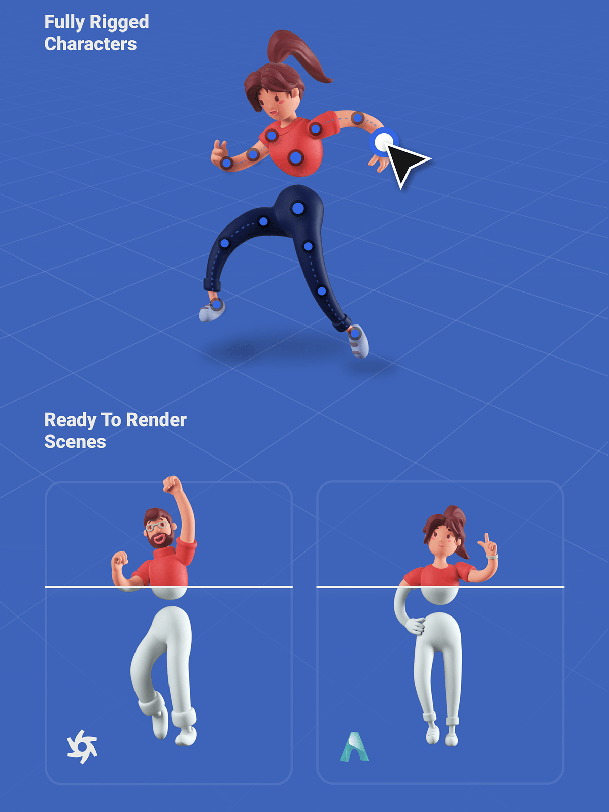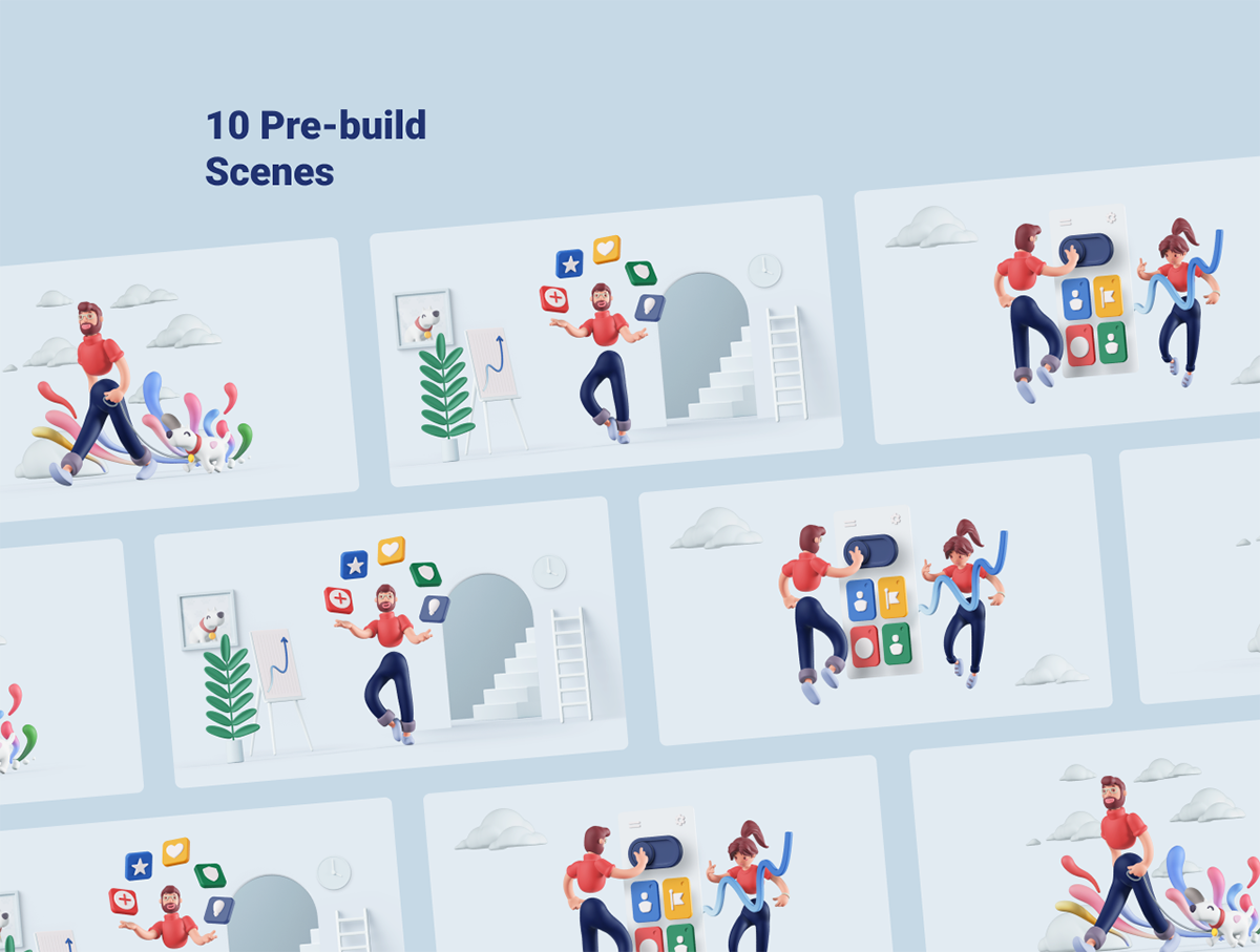 模型数量:包括2个完全绑定角色、每个角色9个不同姿势、35个以上场景对象以及10个预构建场景、只需单击一下即可在Octane和Arnold渲染引擎中进行渲染。