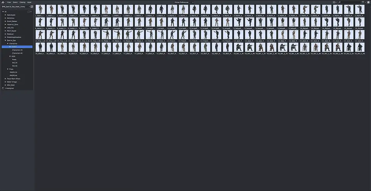 先,这款模型包包含了完全绑定好的人物角色模型,其一大亮点在于包含了20个动作预设和60个Pose动作姿势。这意味着用户不需要从头开始进行动作设计,直接可以选择预设动作和姿势,极大地节省了时间和资源成本。无论是动态捕捉情节还是静态场景布置,这些预设动作和姿势可以迅速搭建出逼真的战斗、巡逻、休息等状态。