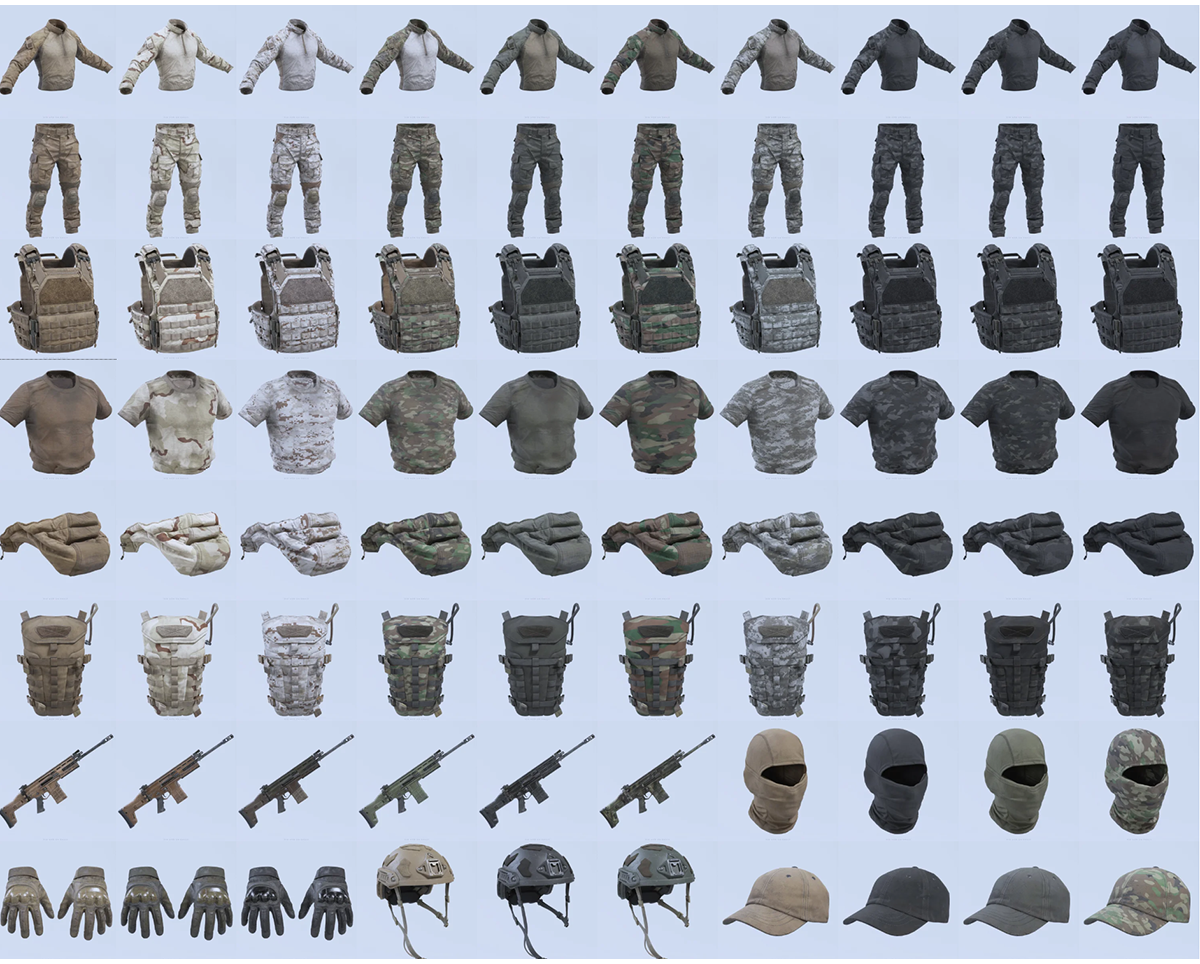 此外,10组衣服设计和3种颜色风格的提供进一步提升了模型的多样性与可定制性。这些设计不仅在外观上变化多端,且三种主色调也能满足不同场景的需求,比如沙漠作战、中性环境或是丛林隐蔽等。值得注意的是,模型包含2K和4K两种分辨率的贴图材质,在不同分辨率的需求下都能够提供极高的视觉效果,从而保证了在不同设备和平台上的一致表现。