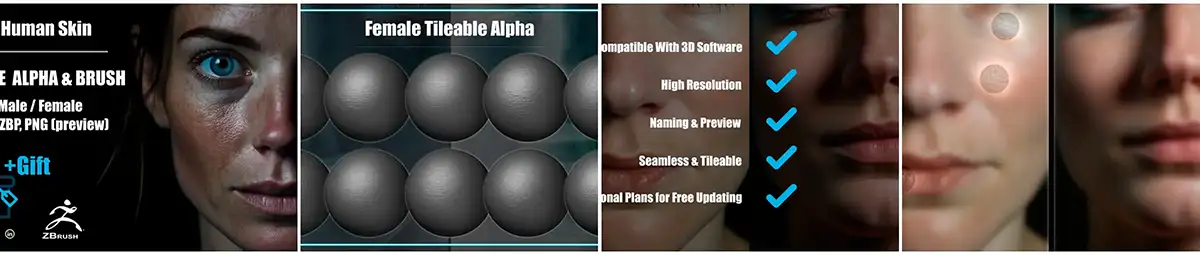 实现真实的皮肤细节通常需要花费数小时的精细工作和关注细节。为精心挑选了最佳皮肤笔刷和Alpha纹理集合,帮助你在几分钟内创造出惊人人类纹理。手工制作皮肤细节工具包包括用于创建华丽数字角色的笔刷和纹理。这些素材经过了无数次打磨,让你能够实现你梦想中的美学效果。此外,全面皮肤Alpha和笔刷包,有你必备Alpha,可以增强你模型和雕塑的真实感。借助这些Alpha,可以为人体或面部的任何部分添加令人难以置信的高分辨率细节。这些Alpha兼容所有3D软件,包括Zbrush、Blender、Substance Painter、Mudbox和3D Coat。