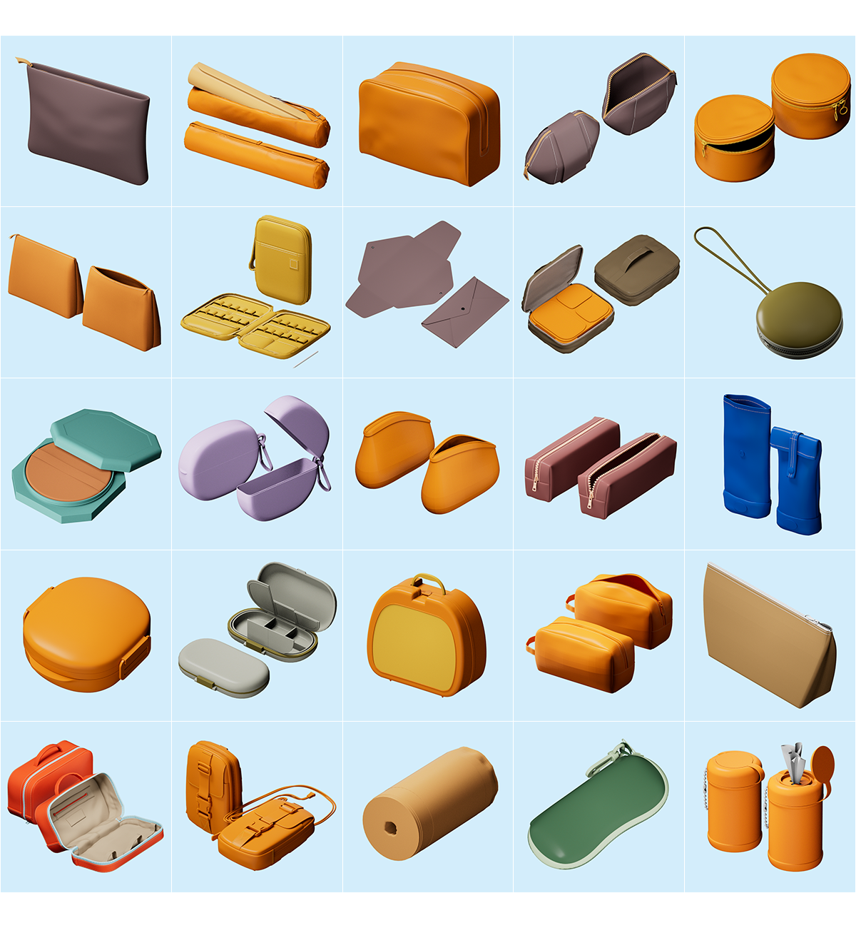 包括:模型对象,化妆包模型、午餐包、化妆袋模型、拉链化妆包模型、钱包、粉扑盒、收纳包