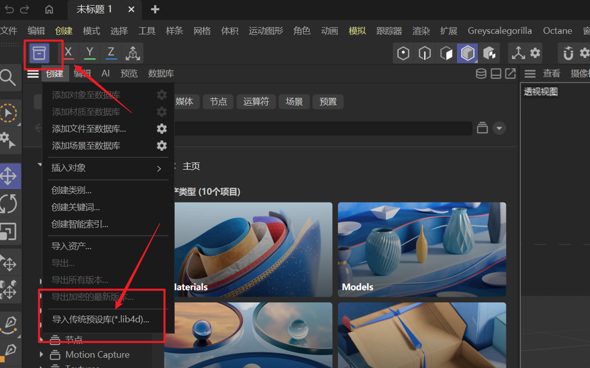 3、回到C4D界面,打开左边内容浏览器按钮,打开“导入传统预设库”路径定位到:C:\Users\Administrator\AppData\Roaming\Maxon\Maxon Cinema 4D 2025_789U552B\library\browser 把刚放置的:.lib4d导进到库。大约需要1~2分钟,等待完成