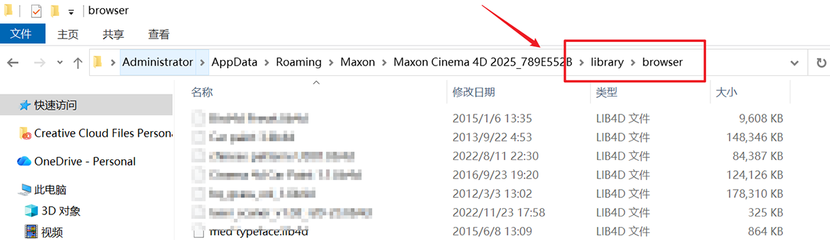2、快速跳转到C4D预设文件放置目录:C:\Users\Administrator\AppData\Roaming\Maxon\Maxon Cinema 4D 2025_789U552B\library\browser文件夹内。把下载好的文件:Octane中文材质预设.lib4d 拷贝到文件夹内。