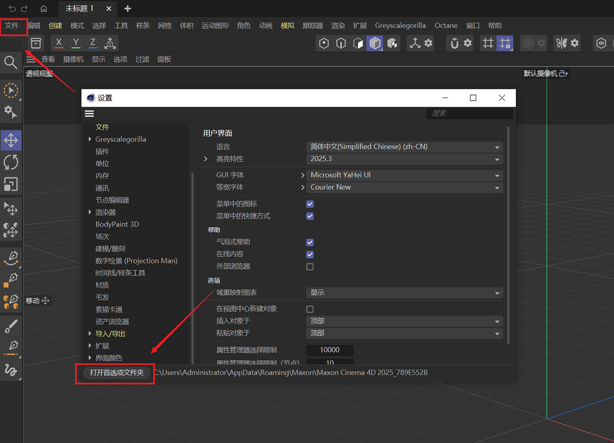 1、启动C4D,在左边顶部菜单,打开:文件-设置-打开首选项设置。