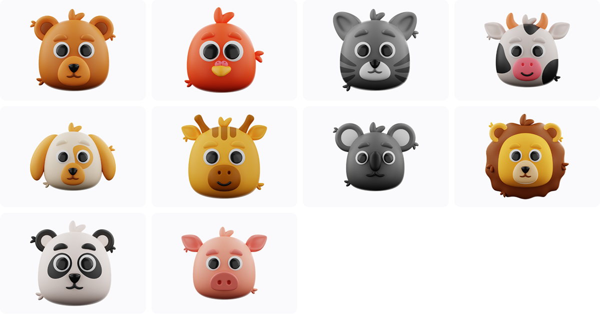 Animal 3d icon set是一套包含10个卡通动物头像的模型合集