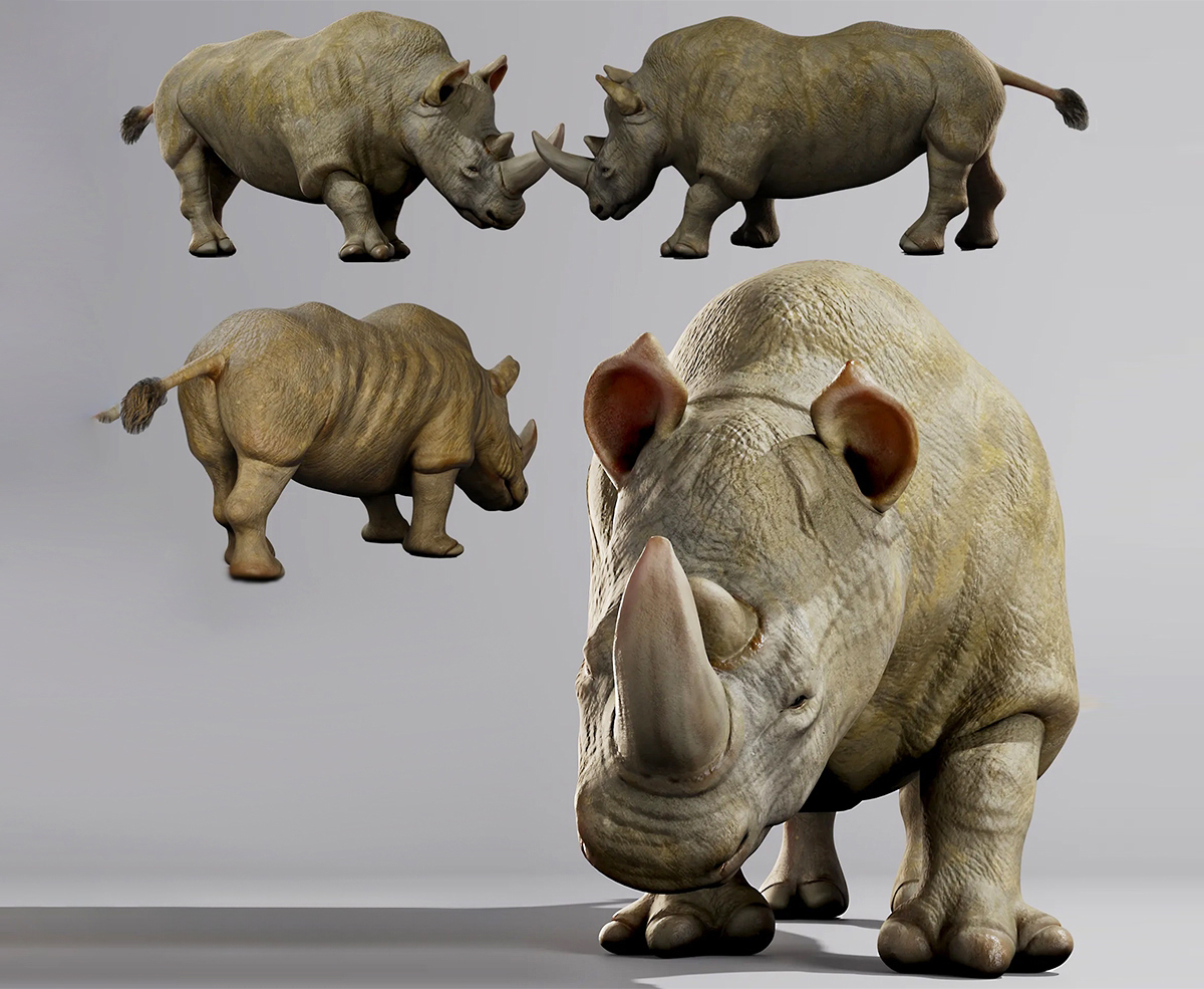模型从多个角度展示了犀牛的特征,包括正面对峙、侧身和特写视角,让使用者能够全方位了解模型的精细程度。模型完美还原了犀牛粗糙的皮肤纹理、强壮的体魄、独特的双角结构以及短而有力的四肢等标志性特征。