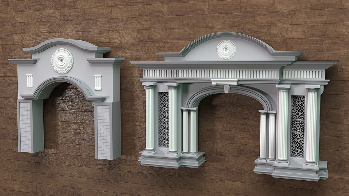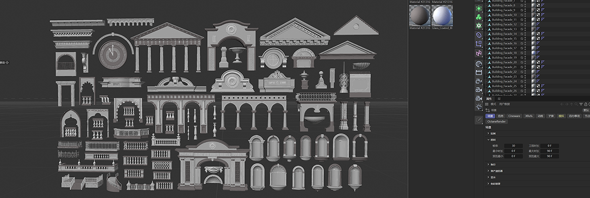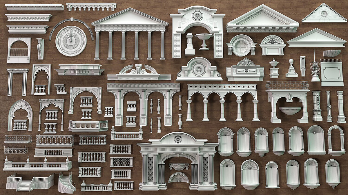 模漾网-88P-欧式拱门柱廊楼梯窗露台栏杆檐饰时钟壁龛花瓶雕塑墙饰元素-建筑模型-Building Facade-88 middle poly architectural kitbach