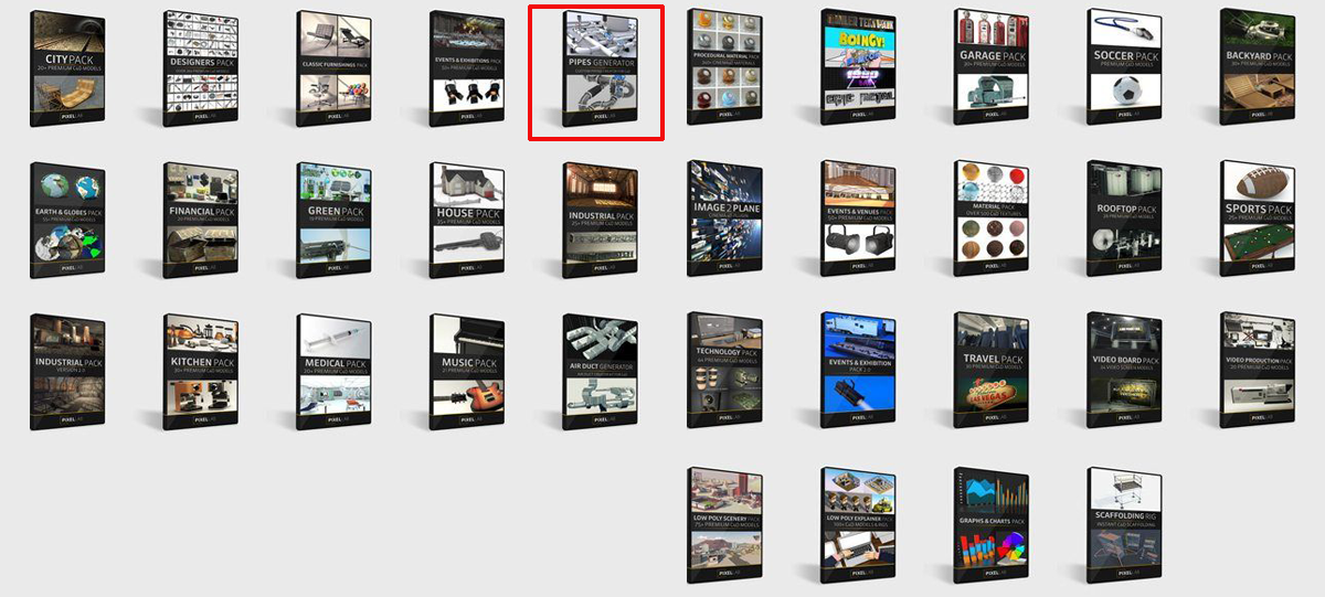 合集中53P资产,下图资产预览,是上图“红框”单个资产文件包的预览::Announcing the Pipes Generator for Cinema4D