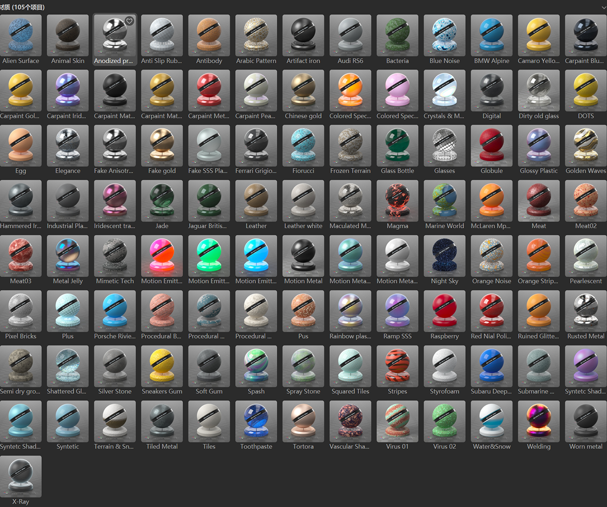 钢铁、玻璃、车漆、矿物、有机物、塑料、设计感等多方面效果材质,所有的材质细节程度都可以调节调节的。