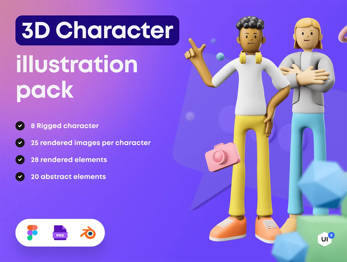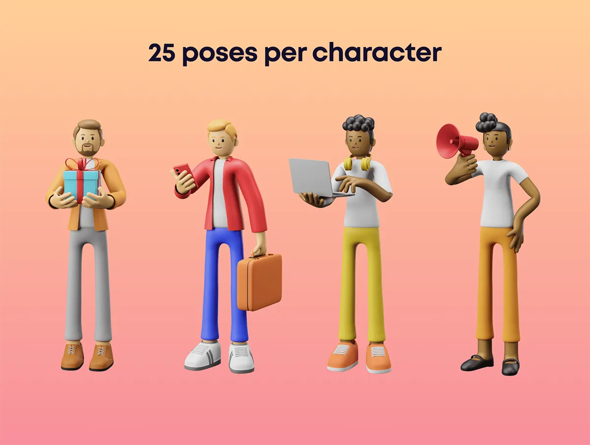8个不同角色,可以为你的工作选择,也可以在C4D或BLENDER里摆出自己需要的姿势。