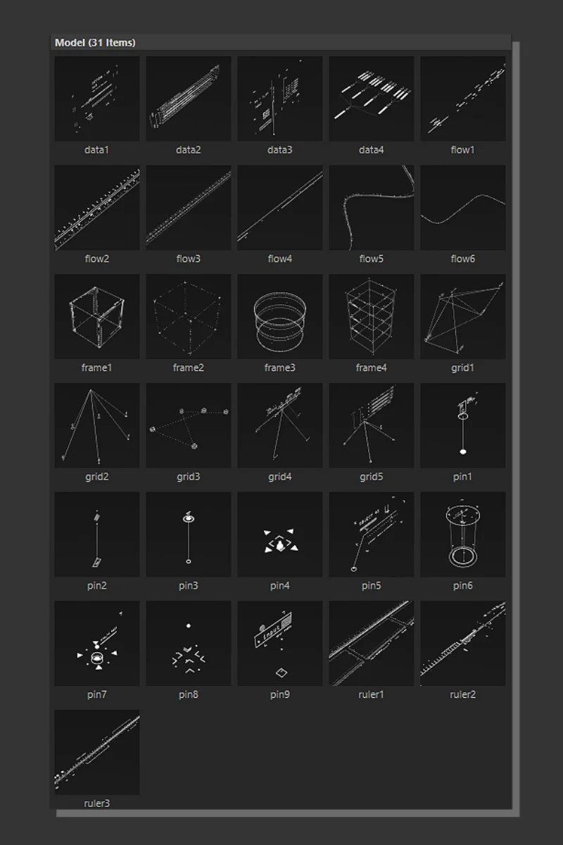 共包含:31个基于xpresso的三维动画程序化HUD视觉元素,每个元素都是按照现代界面美学和未来科技语言倾心打造,无论用于复杂信息可视化界面还是高科技机械组件细节,均能完美融入您场景。具体分为6大元素类型,分别为数据元素、流元素、框架元素、网络元素、图钉元素和规则元素。每个类型的元素各具特点:4个数据元素用于精准呈现动态数据仪表、进度环、雷达或扫描表盘等常用界面;6个流元素构建光流、能量箭头、传输线路等动感引导;4个框架元素则专注于构建3D交互边框、面板分割、动态旋转矩阵等高端UI框架结构;5个网络元素打造复杂节点联通、信息传递、流量监测等数字化场景;9个图钉元素偏重高精度定位、锁定、追踪等运动物体的屏幕标记以及多目标可视追踪;3个规则元素用于界面标尺、指标、刻度线性校准,适合做数据仪表、目标对齐显示等扩展。这31个元素不仅样式精致、动画流畅,而且均可通过Xpresso节点程序进行深度自定义,动画速度、颜色、厚度、透明度、动态范围、指示标记、点线面类型等参数均可随时调整并实时预览,极大方便用户创意需求快速搭建独特的UI界面或动画系统。