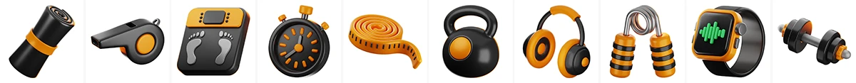一组10P–Fitness 3D Icon Pack-卡通健康健身图标-模型合集。包含:哑铃、健身手表、手柄、耳机、壶铃、测量仪表、秒表、体重秤、口哨、瑜伽垫。