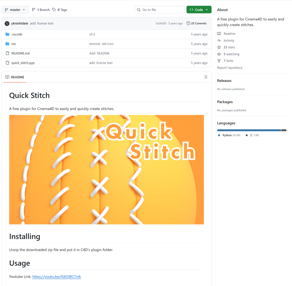 安装方式:复制 quick_stitch_c4d-master 文件夹,放到c4d插件目录plugins里即可