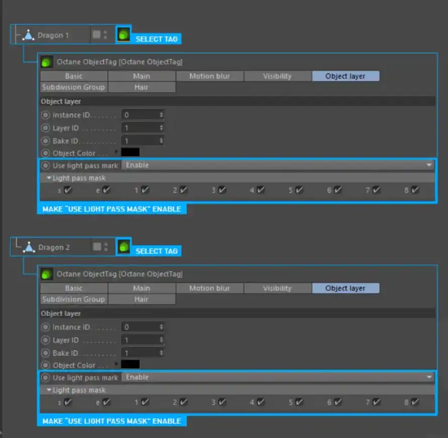 现在我们必须给对象,加oc标签,进行Octane Object Tag设置。 右键单击每个龙对象,然后在下拉菜单中转到“c4dOctane标签”,然后选择“ Octane ObjectTag”。 在这里,您可以看到新功能“ Use Light Pass Mask”。 为了使Light exclusion起作用,您必须“启用”此功能。 您可以在下图中看到设置。 现在,请勿更改“光通过蒙版”中的任何内容。稍后我们将解释它们的功能。