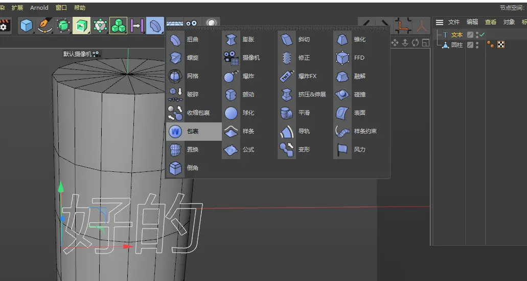 对象面板,选中“好的”;换到顶视图,选择实时移动工具,把“好的”文字移到圆柱前面来。贴着圆柱