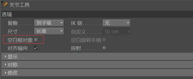 选择角色——关节工具,将其属性的‘空白根对象’的√去掉