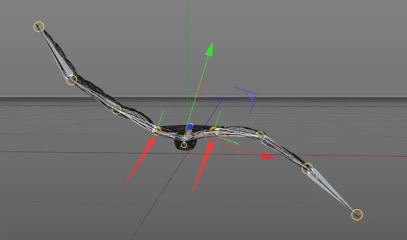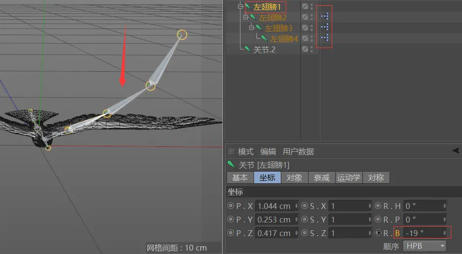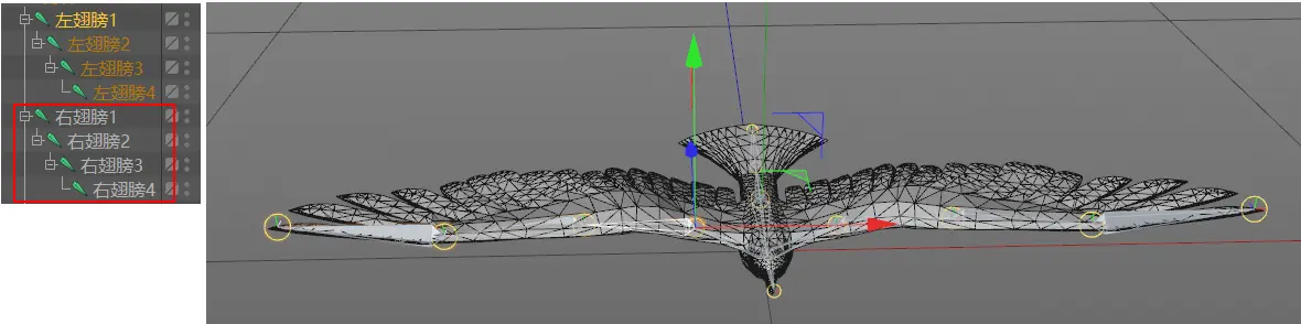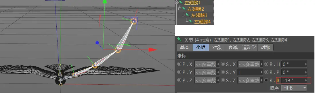这个时候全选所有的翅膀关节,调整旋转角度即可观看翅膀摆动的效果