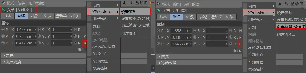 5.为了方便控制,我们不可能每个关节都要手动控制,所以需要在第一个关节(左翅膀1)添加主驱动,其他关节添加被驱动(相对位置的),从而达到主关节带动其他关节旋转的效果【其他方法:使用IK标签实现摆动】