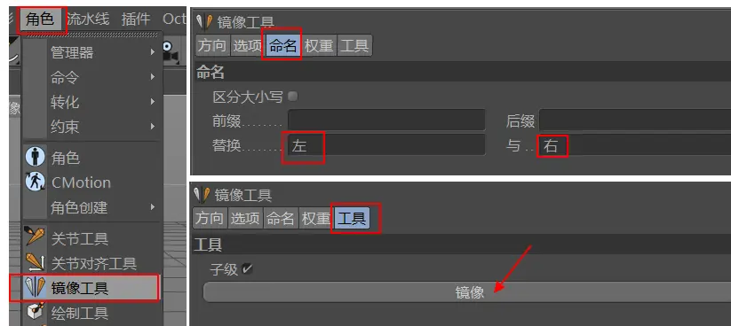 6.接下来,我们将另一边翅膀的关节复制出来,利用镜像工具快速复制并重新命名,只需选择翅膀1,点击镜像工具,替换左与右,点击镜像即可