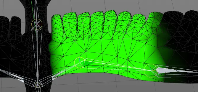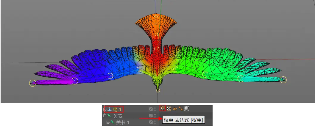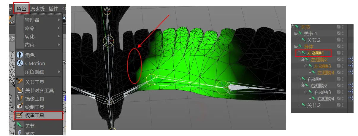 8.优化权重,例如,为了让左翅膀1的关节影响的范围更大,需要将圈出来的黑色区域用权重工具刷成绿色。至于其他关节,看情况刷。