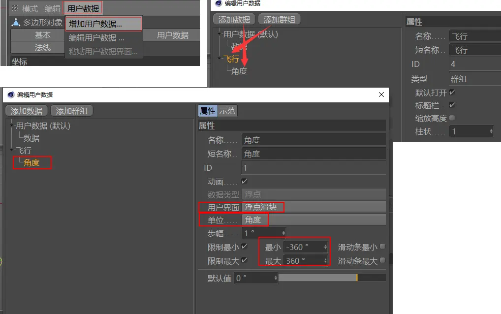 点击模型鸟的对象,点击用户数据——增加用户数据,然后在窗口中点击添加群组、添加数据(注意父子级关系,前面的默认不用管),重命名之后,在角度的用户界面改为浮点滑块,单位角度,最小改为-360°(最大最小值看情况调整)