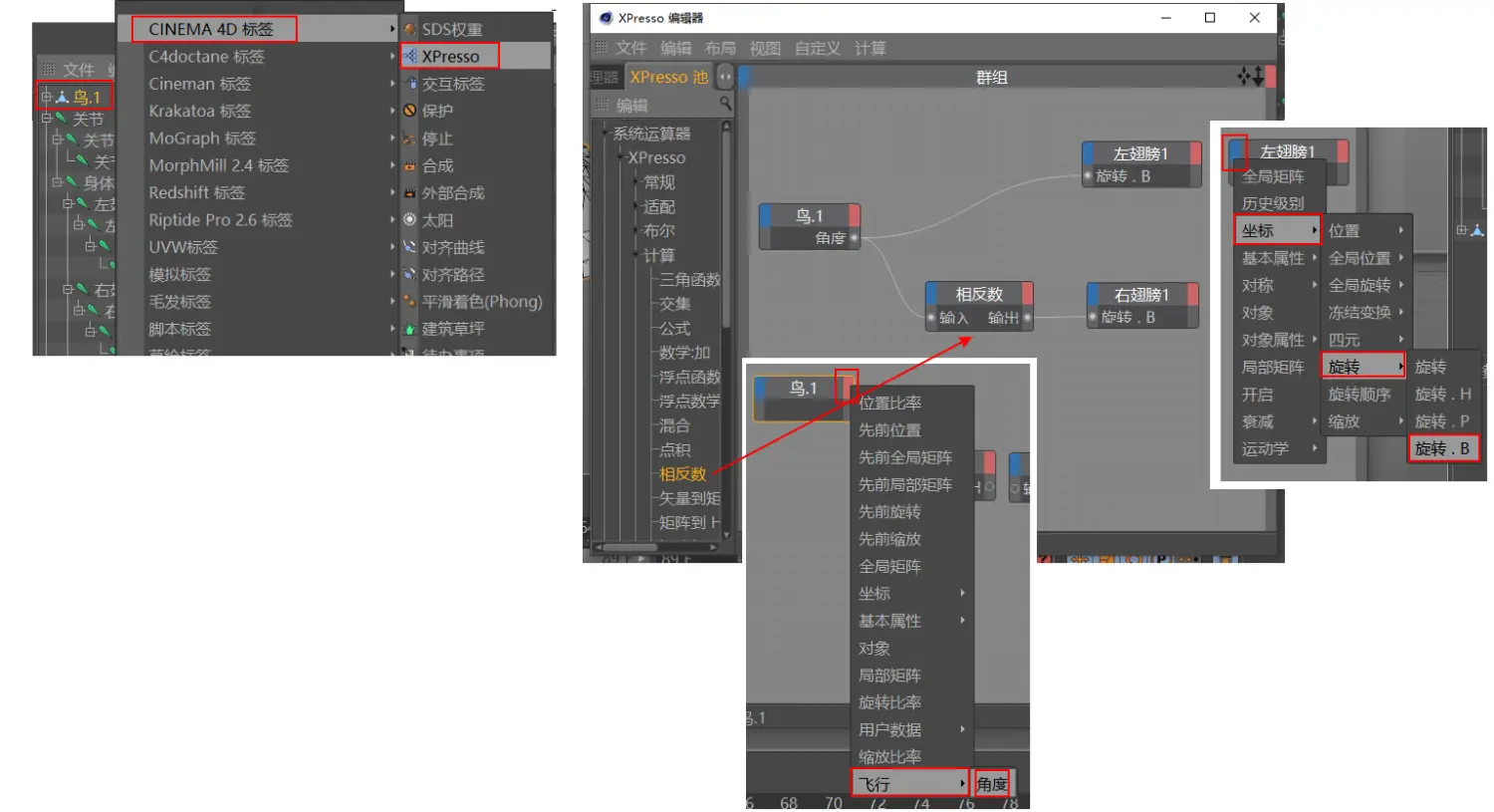 10.在模型鸟添加C4D——XPresso标签,来添加节点表达式。分别将鸟、左 右翅膀和相反数添加到XPresso编辑器中,并点击鸟节点的红色区域(输出端口),找到刚才新增的属性飞行——角度添加到输出口,再在翅膀的蓝色区域(输入端口)找到坐标——旋转——旋转.B添加到输入口。依次将其链接